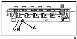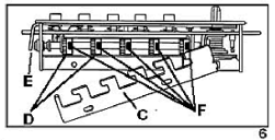 Note: The unlocking slide (C) is under spring tension and will be easier to lift if pushed to the left to ease tension. Swing the unlocking slide (C) sufficiently to clear the gears, (D) no further than shown in figure 5.