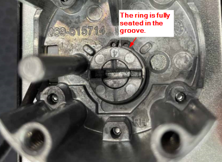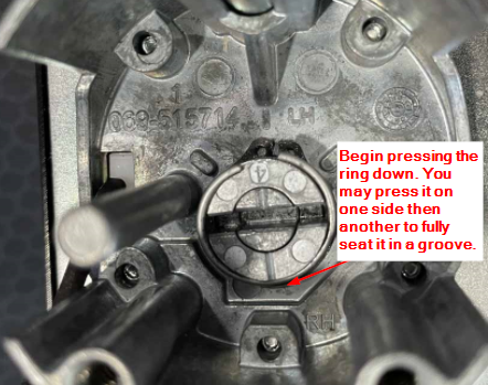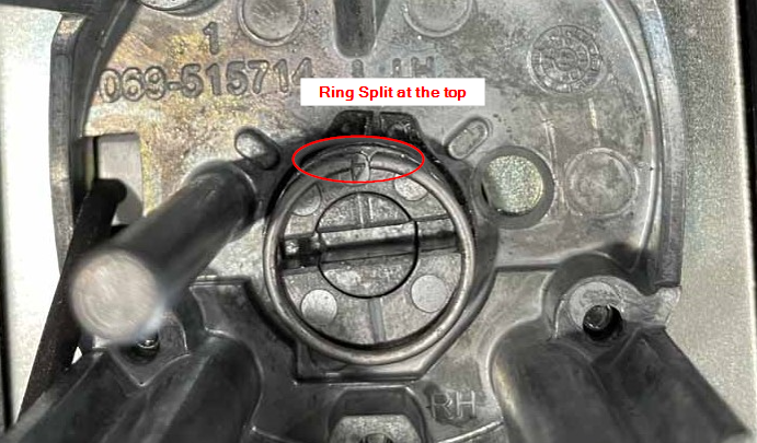Lay the new ring on the hub with the split pointing toward the top of the lock (12 o’clock when normally mounted).