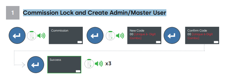 Answer Pre-commissioned locks will unlock by pressing 1 Step 1: Commission Lock and Create Admin/Master User Step 2: Change Admin/Master Combo |