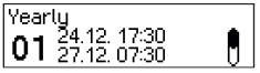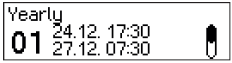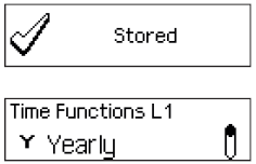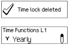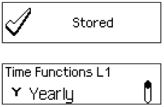 The Yearly Locking Period is stored. The input unit returns to the menu option “Time Functions L1 Yearly”. You can now configure additional Yearly Locking Periods (repeat steps 6 to 9) or return to the standard mode display. |
