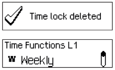 The Weekly Locking Period is deleted. The input unit returns to the menu option “Time Functions L1 Weekly”. You can now delete additional Weekly Locking Periods (repeat steps 15 to 18) or return to the standard mode display. |