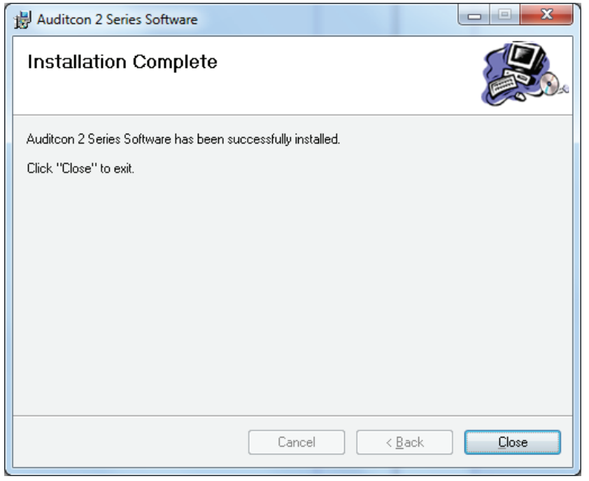 The Installation Complete screen is then displayed indicating that the Auditcon 2 Series Software program has been successfully installed.