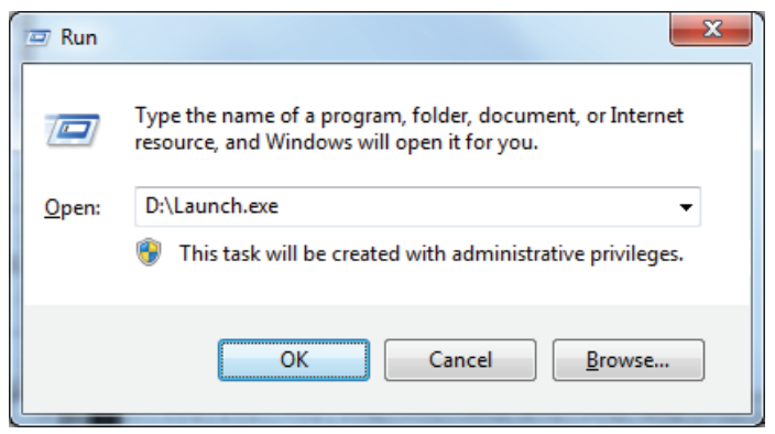 Next select the Run icon from the Windows menu. The Run Window will be displayed. If necessary, change the path to point to the drive being used to install the software.