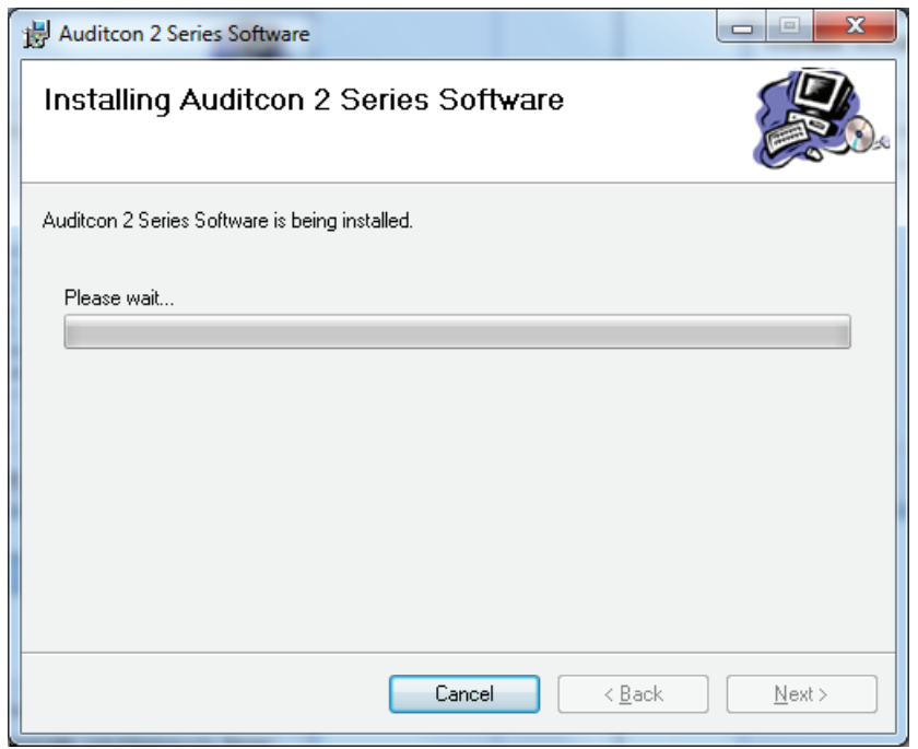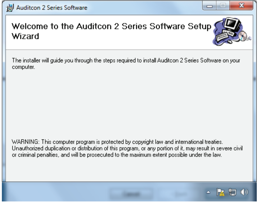 Once the preparation is completed, the Auditcon 2 Series Software Setup screen will be displayed. The Setup Wizard is a Windows program that will take you through the rest of the setup process.