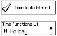 The Holiday Locking Period is deleted. The input unit returns to the menu option “Time Functions L1 Holiday”. |