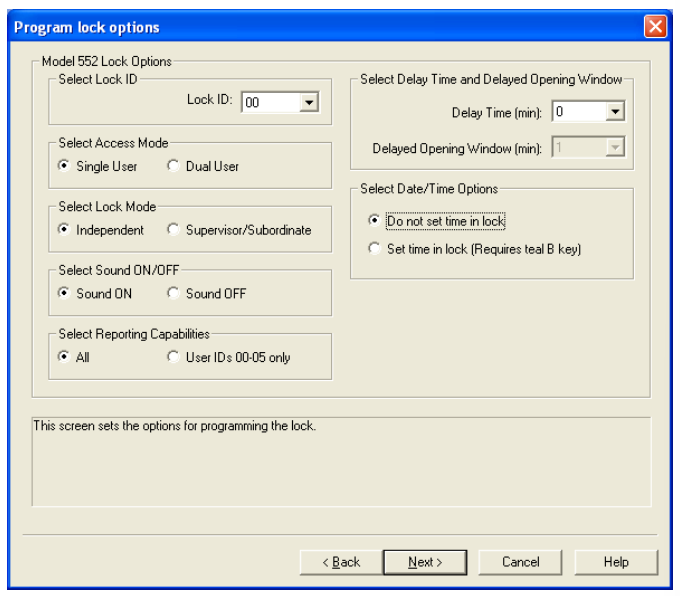 Answer The first option on the Locks menu is “Program Lock”. This menu item is used to initiate the program locks wizard and is only applicable for Model 252 or 552 locks. It should be selected to define the original lock setup data, users, and time windows for a lock. If you choose the “Program the Lock” menu option from the Auditcon 2 Series PC software, you can define the following data in a lock: