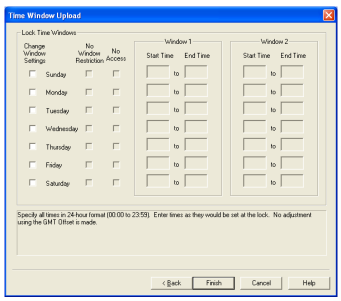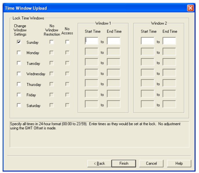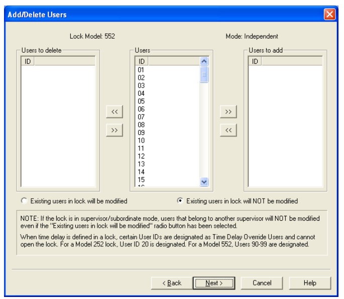 Note: Some beeps will always sound regardless of whether the sound is toggled “on” or “off”. They are as follows: beeps to indicate lock is powered, beeps that sound during the open window after a time delay, beep that accompanies the Clear () key, beeps that sound between combination entry for Dual access. 8. Select the reporting capabilities for the lock. The default is All, but you can also choose to Note: When Time Delay is set in a lock, designated Users (Access or Subordinate) become Time Delay Override Users. Users who have the ability to override Time Delay cannot open the lock. User ID 20 is designated for this purpose in a Model 252 lock while Users 90-99 are designated in a Model 552. 10. If you are programming a Model 552 lock and would like to set the date and time in the lock, Note: The date and time in the lock must be set if you are going to implement time windows or timed lockouts in the lock. The teal colored “B” key is required to program the lock if this option is selected 11. Click on Next to continue. You will be prompted with the Program Lock - Add/Delete Users screen. Note: In Super/Sub mode certain User IDs are reserved for Supervisors. For a Model 252 in Super/Sub mode, User IDs 01 through 03 are reserved for a Supervisor. For a Model 552 User IDs 01 through 05 are reserved for Supervisors. Certain User IDs are reserved for the ability to perform a Time Delay Override when Time Delay has been set in the lock. For a Model 252 lock, User ID 20 can perform this action. For a Model 552, Users 90-99 have this ability. 12. Select the User ID(s) for whom you want an add or delete operation performed at the lock. To select an individual User ID, highlight the user in the appropriate list box and click the To select multiple sequential User IDs, click the first user you want to select, press and To select multiple non-sequential User IDs, press and hold down the Ctrl key, click each Note: If you are programming the lock to operate in Independent Mode, you have the option to add all of the valid Users (other than the Master User) for a lock model at this time. If, however, you are programming the lock for Supervisor/Subordinate Mode, you will only have the option to add the valid Supervisor User IDs for the lock model. Once the Supervisor IDs have been defined in the lock and the Supervisor PINs have been manually changed at the lock, then the Add/Delete Users option can be selected from the software to add Subordinate Users for individual Supervisors. 13. If you are programming a Model 252 lock, ensure that a Smart Key has been placed in the If you chose a Model 552 lock, you will also be prompted with the Program Lock - Time Window Upload screen. Note: If you have set the Time Window Dialog Setting to “Use time window settings last entered”, the data displayed in the screen will default to the last data entered. See the “System Settings” option on the Settings Menu for details. 14. To change the window settings for a given day, click on the Change Window Settings box for Note: The time window access values will default to “no window restriction” at the lock unless defined otherwise via manual programming at the lock or via data upload to the lock from the software. Once the Change Window Settings box has been selected for a specific day, the other input fields for that day will become enabled for data entry. 14a. If you want No Window Restriction (24 hour access) for the selected day, select the 14b. If you want no lock access allowed for the selected day, select the No Access box. All other 14c. If you want to limit access to a certain time period of the selected day, define an access time Caution: If a GMT offset is set, it is NOT used to adjust the values entered in Start Time and End Time. The time values entered should reflect lock times. There can be some drifting in the lock clocks in the Model 500 and 552 locks, up to 15 minutes per year. Because of this possible variance, there should be minor allowances made in both the starting time and the ending time when setting time windows. Note: When data is entered for Window 1, the same Start and End Time will automatically be filled in for Window 2. If you want to define a second access time window for the selected day, update the Start Time and End Time under the Window 2 section of the screen to the values for the second window. 15. Tab to the Start Time in Window 2. If you want to define a second access time window for the selected day, update the Start Time and End Time under the Window 2 section of the screen to the values for the second window. Note: If you do not choose to define a second window, the second window will default to the same time period as the first window. Repeat steps 14 and 15 for each day that you would like to define lock access. 16. Once you are finished with the Time Windows screen, ensure that a Smart Key has been placed in 17. The key should now be taken to the lock to program the lock data. Note: Previous to uploading the Program Lock data to a lock, the Master User PIN must be “set” in the lock. The default PIN assigned to a new User or Supervisor ID is “502550”. A user must change this default PIN before any lock operations can be performed. |
