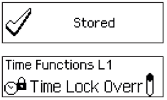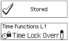 The Time Lock Override is stored. The input unit returns to the menu option “Time Functions L1 Time Lock Overr.”. You can now configure additional Time Lock Overrides (repeat steps 5 to 9) or return to the standard mode display. | ||