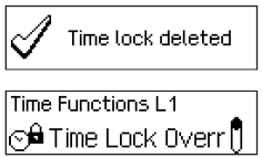 The Time Lock Override is deleted. The input unit returns to the menu option “Time Functions L1 Time Lock Overr.”. You can now delete additional Time Lock Overrides (repeat steps 15 to 18) or return to the standard mode display. | ||