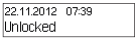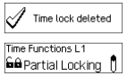 The Partial Locking Period is stored. The input unit returns to the menu option “Time Functions L1 Partial Locking”. You can now configure additional Partial Locking Periods (repeat steps 5 to 9) or return to the standard mode display. |