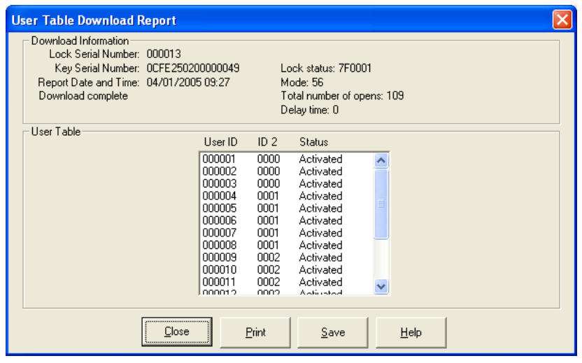 Answer This option is used to generate a report from an SA key that has been used to download the user table from a lock. 1. Select Report on User Table Download Key. The SA Key reminder message is displayed 2. Make sure that the SA key with audit data is in the key reader. 3. Click on the OK button to close the window and display the audit data. The ID 2 field on each user table record indicates the User ID of the person who added the You may print the report by clicking on the Print button. The following confirmation