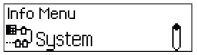 2. Keypad input unit: press and hold down <CLR> key. Release key as soon as the Info menu appears. Dial knob input unit: press and hold down dial knob. Release dial knob as soon as the Info menu appears The first menu option (“System”) of the Info menu appears. | ||
