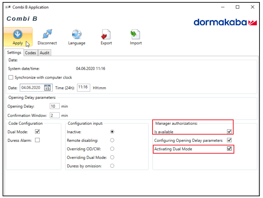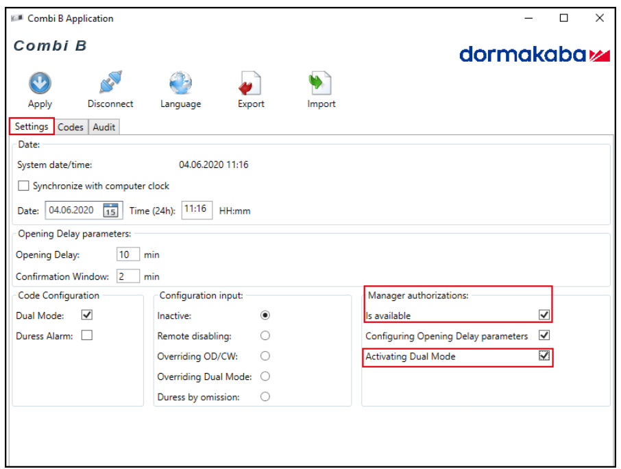 If the code with the ID 01 is set and the Manager Code is activated (the checkbox 'Is available' is selected), the Manager can activate or deactivate the Dual Mode.