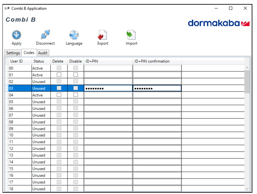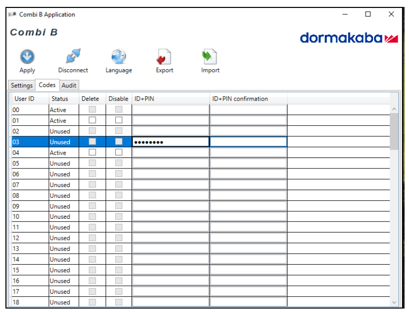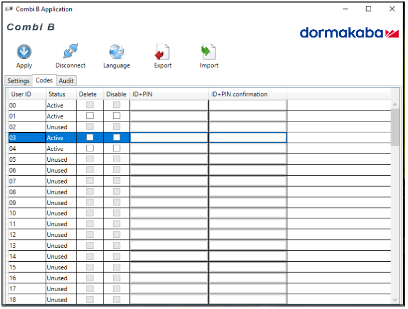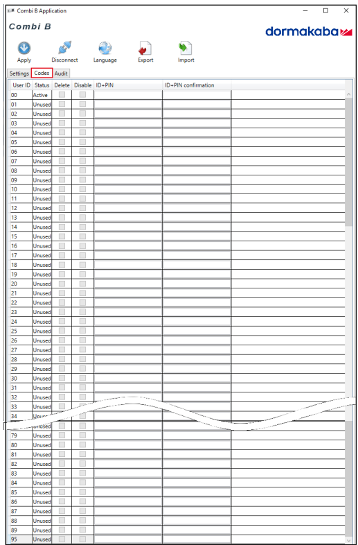 2 audit entries are generated when a new code is assigned to an already added ('active') user. One entry for the old user code 'unused' and a second entry for the new user code "active". There are 90 codes. 1 Master Code with the ID 00, 1 Manager Code with the ID 01 when the Manager is activated, 88 User Codes and 1 Courier Code with the ID 95. If the Manager Code is not activated, there are 89 User Codes. On the Codes tab it is possible to add, enable, disable and delete users.