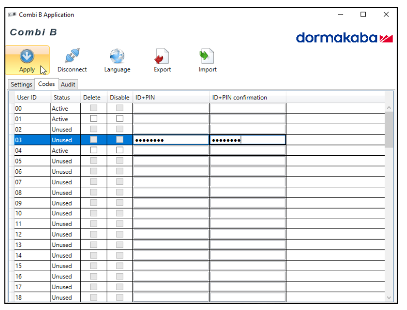 Activating codes It is possible to change or cancel code entries or any selected function before clicking on Apply. Otherwise all selected settings will be transferred to the lock.