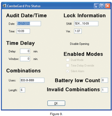 Lock Status Click on the Lock Status button to display status information about the Lock. A window is displayed showing the audit date and time, Time Delay settings, Lock version, the status of all users, etc. (Figure 9).