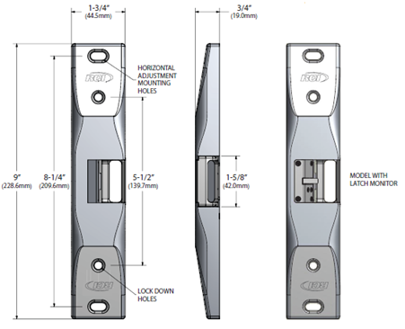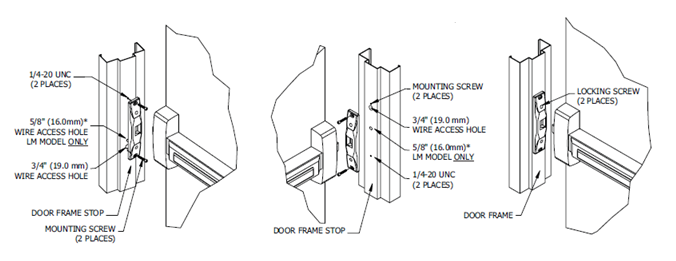 Important: The RCI F0162LM or the 0162LM Electric Strikes should never be used as a door stop. Please install stops on frame in appropriate locations. Ensure the exit device functions as intended for life safety concerns by verifying electric strike and exit device compatibility. Maximum latch projection is essential to obtain full holding force.
