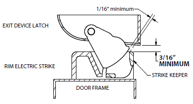 NOTE: Ensure a 1/16” [1.5mm] clearance between exit device latch and the electric strike keeper is maintained. Failing to do so will preload the strike and in turn will not allow the strike to release the door upon energizing. WARNING: For proper operation, a 3/16” gap (minimum) is required. |