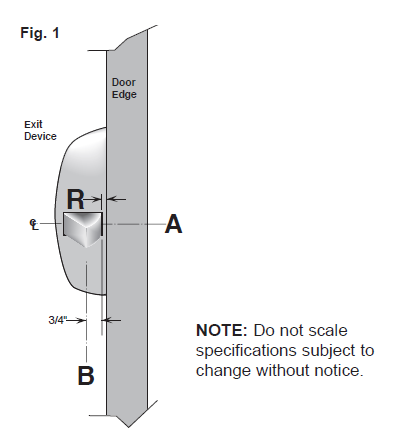 2. Determine the vertical center line “B” for the Electric Strike by adding 3/4" to dimension “R”. (See Fig. 1)