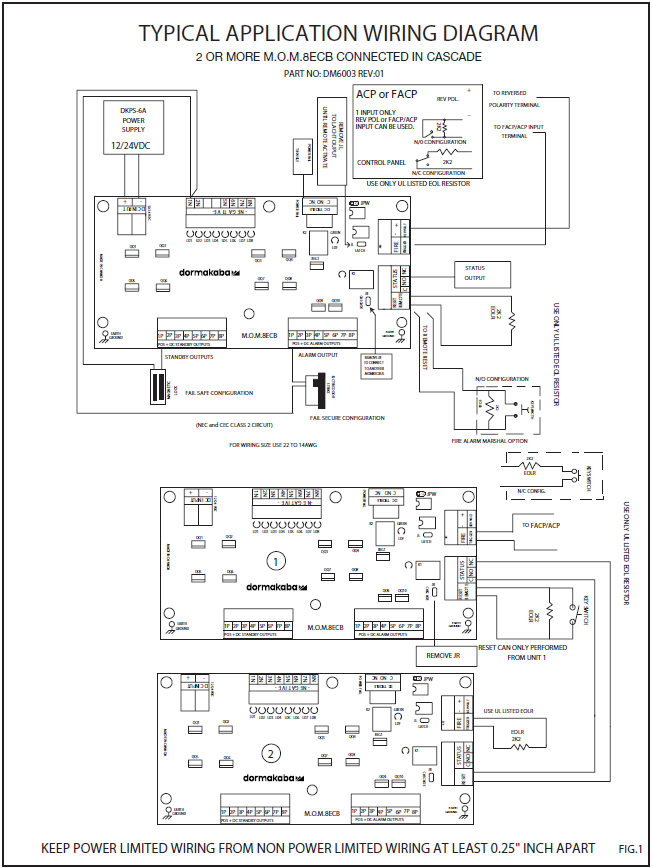 Normally Open (NO), Normally Closed (NC) input or Polarity Reverse (Rev. Volt.) input are available to trigger the M.O.M.8ECB operation. Connect the positive (+) and Negative (-) from the FACP/ACP to the REV. VOLT terminals observing the polarity (polarity is referenced in alarm condition) or connect the NO or NC from the FACP/ACP output to the “Fire Trigger Terminals”. Install a 2K2 Ohms EOLR-PWX2K2 resistor at the FACP/ACP as shown in Fig 1.