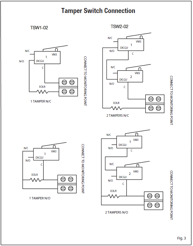 - If a Tamper Switch is required, use part # TSW1-02 or TSW2-02, see Fig 3. Use 2K2 EOLR (end of line resistor) Part #EOLR-PWX2K2