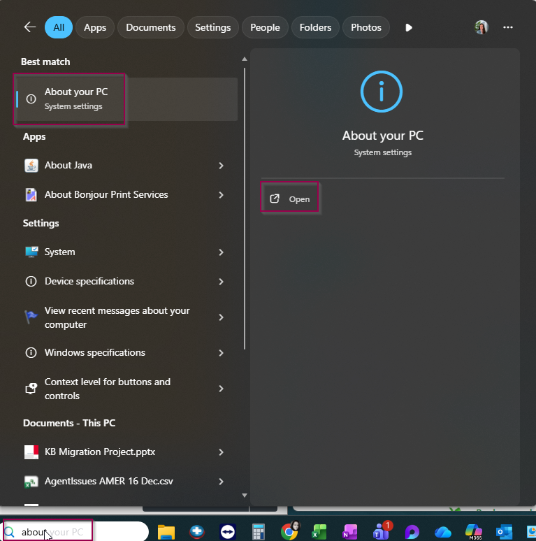 - Search "About" in the Windows search bar.