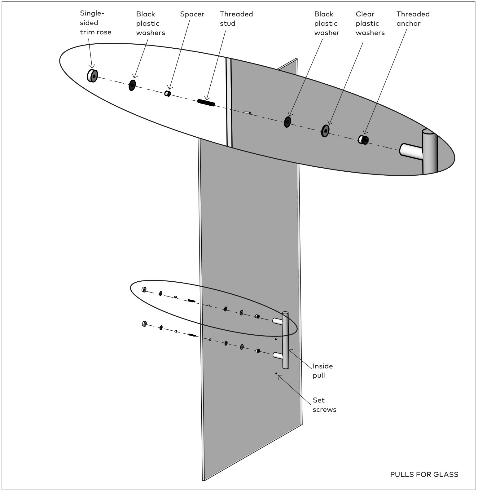 • spacer - Feed the stud, spacer and rose assemblies through the glass door.